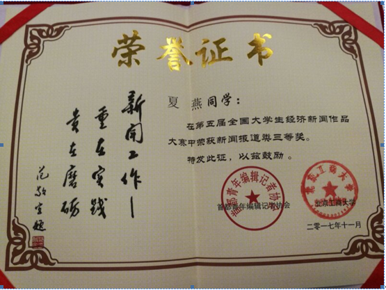 11月18日,第七届全国经济新闻改革与发展研讨会暨第五届大学生经济新闻作品大赛颁奖会在京召开。本次活动由中国经济报刊协会、首都青年编辑记者协会、北京工商大学主办,北京工商大学艺术与传媒学院承办。我院新闻传播系获“优秀组织奖”、新闻传播系学生夏燕获新闻报道类三等奖。