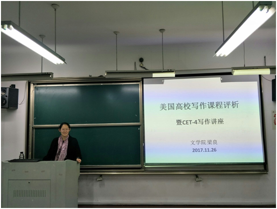 11月26日晚,主题为“美国高校写作课程评析暨CET-4写作讲座”在明德楼401教室举行。文学院梁良老师担任此次讲座的主讲人,17级百余名同学参加讲座。