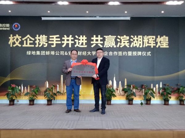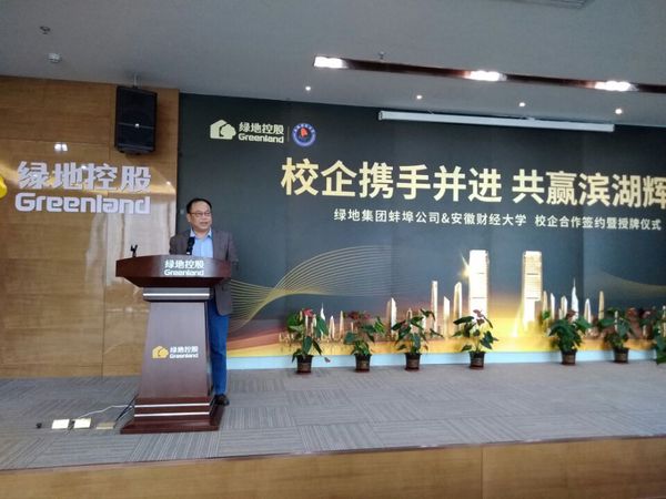 3月29日下午,1701vip黄金城最新登录与绿地控股集团股份有限公司学生就业实习基地签约仪式在蚌埠市绿地中央广场珠峰大楼举行。文学院院长周平、党委书记袁世骏、党委副书记刘晓光、副院长朱松林、新闻传播系副主任程军、绿地集团蚌埠置业有限公司营销总监赵汉忠等出席了签约挂牌仪式。