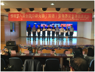 2019年5月11日,第八届全国口译大赛(英语)安徽赛区大赛在安徽工业大学举行,我院商务英语专业15级学生姜俊鹏在大赛中荣获一等奖,商务英语专业16级学生卿嘉慧、孙芳琴、张智鹏获得优秀奖。