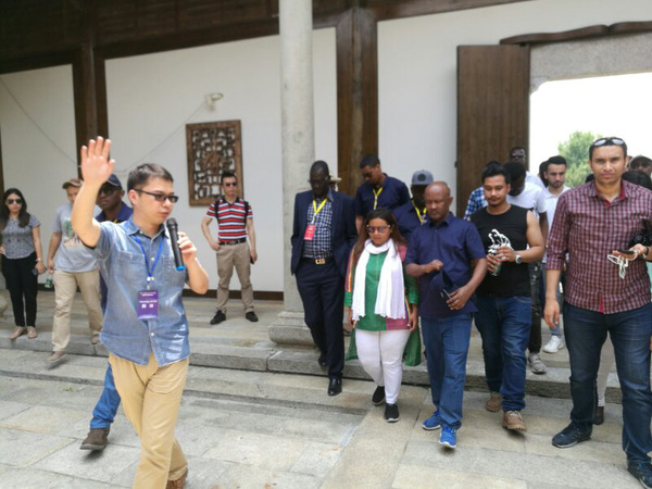 6月6日上午,常锟、褚汉在活动举办地安徽水利和顺大酒店提供实时翻译。下午,两位教师陪同外宾参观了蚌埠市规划馆和蚌埠市博物馆,其中褚汉老师为市规划馆进行了英文讲解。