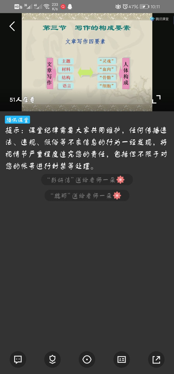 陈静宇老师本学期带《演讲与口才》与《写作与沟通》各两个课头,因为直播课程常常有一些不确定因素和学生线上答疑随时需要处理,完全直播怕有可能多方面不好兼顾,于是采用录播和直播相结合的方式:适合录制的课程,使用嗨格式录屏大师软件录制成MP4格式,每周录课几乎象正常在教室上课讲课一样详细;不适合录制的如线上讨论、线上浏览资料、布置作业等,使用直播。这样上课时使用录制好的内容播放,学生在讨论区可以随时提出问题,老师也方便及时做出回答,学习效率更高!上课时使用的软件是腾讯课堂极速版,腾讯课堂极速版播放录屏视频或其他视频都很方便,尤其是MP4格式,PPT播放和分屏共享功能也很便捷,关键系统自动生成的成员列表导出后可以清晰地展示出每个同学进入课堂的时间节点,更能观察到学生在线学习的时间,比签到更精确。目前课堂整体流畅!教学进度基本可以保持和教室上课一样的节奏!