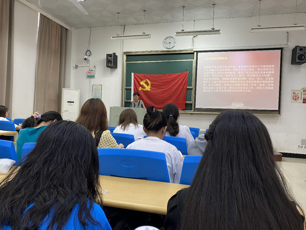 6月30日下午,院党委副书记虞鲲在明德楼103教室为新党员上党课,51名预备党员聆听党课。