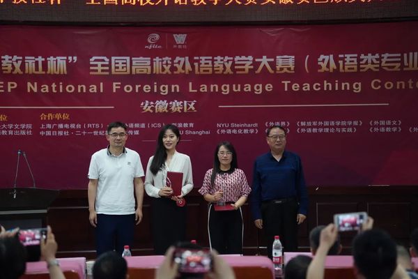 安徽赛区比赛由安徽省外国语言文学学会、安徽省外国语言文学类专业合作委员会主办,1701vip黄金城最新登录、上海外语教育出版社承办。来自全省20所本科高校的99名选手(含团队成员)参加本次比赛。经过复赛和决赛的激烈角逐,来自安徽工程大学的韩利敏教学团队和来自阜阳师范大学信息工程学院的贺琳教学团队分别荣获英语专业组和商务英语专业组特等奖。韩利敏老师和贺琳老师将代表安徽赛区参加今年12月在上海举行的全国决赛。
