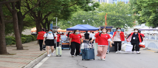 行李消杀,测量体温,检查录取通知书、健康码、行程码、48小时内核酸检测报告,核对个人信息,发放报到证、校园卡和军训服装领取单、口罩等,党员志愿者为新生提供报到注意事项、校园路径等咨询服务,团学青干部从新生到达报到点开始全程引导,无数身穿红马甲的志愿者不辞辛劳,一路陪同,帮助新生搬运行李、登记住宿、答疑解惑,只为给新生们提供贴心的服务,淋漓尽致地展现了“奉献、友爱、互助、进步”的志愿精神。