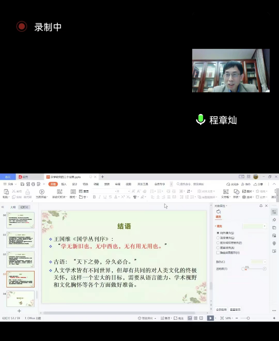 2022年10月31日晚7点,南京大学古典文献研究所所长、博士生导师程章灿教授通过腾讯会议为我校师生作了题为“国学、汉学、中国学——中国研究的三个世界”学术讲座。本次讲座是“国学经典导读班” 第六次讲座,由文学院院长方军主持,我校近150名师生聆听了讲座。