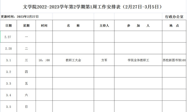 文学院2022-2023学年第2学期第1周工作安排表(2月27日-3月5日)