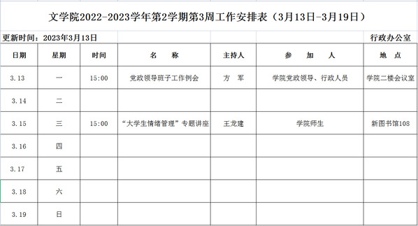 文学院2022-2023学年第2学期第3周工作安排表(3月13日-3月19日)