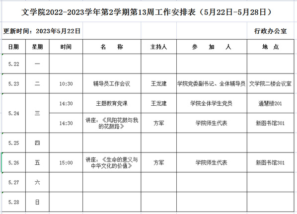 文学院2022-2023学年第2学期第13周工作安排表(5月22日-5月28日)