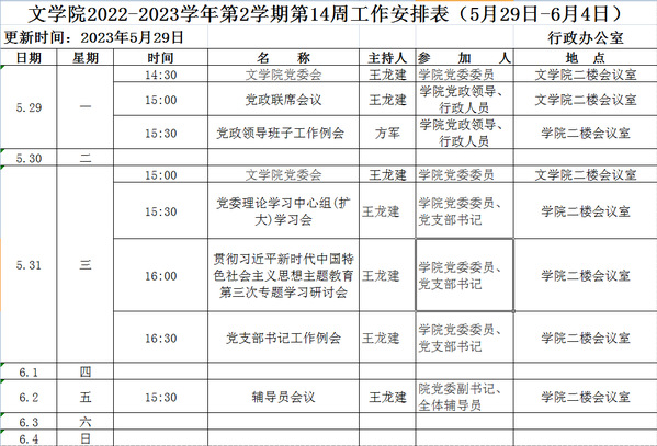 文学院2022-2023学年第2学期第14周工作安排表(5月29日-6月4日)