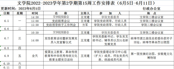 文学院2022-2023学年第2学期第15周工作安排表(6月5日-6月11日)