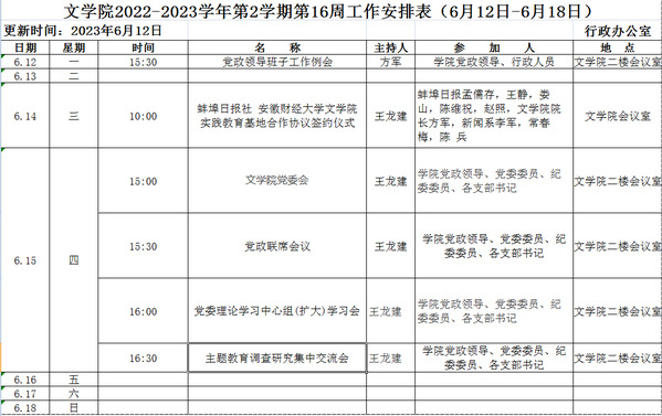 文学院2022-2023学年第2学期第16周工作安排表(6月12日-6月18日)