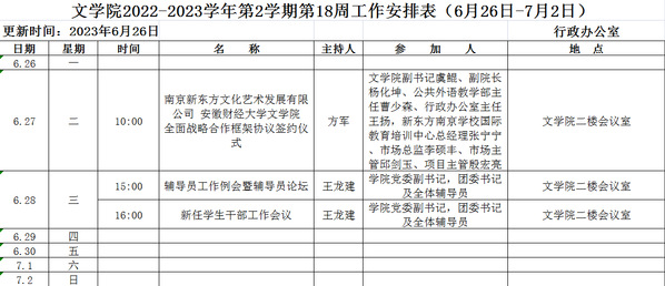文学院2022-2023学年第2学期第18周工作安排表(6月26日-7月2日)