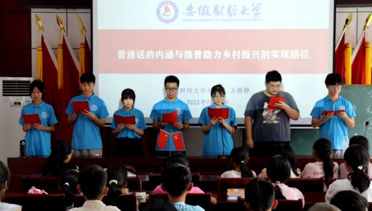 为大力推行和规范使用国家通用语言文字,7月13日,文学院“小小少年分队”在指导老师潘慧琼和王静静的带领下前往蚌埠市怀远县砖桥村开展以“推普助农 乡村振兴”为主题的暑期社会实践活动。