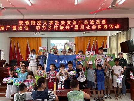 实践活动以安庆历史文化故事为开场,队员们向村民讲述了“长江塔王”振风塔、悠久的倒扒狮老街、安庆地道品牌“胡玉美”和“麦陇香”以及漳湖镇红色英雄董玉发的故事,迅速拉近了与村民之间的距离。随后,同学们用普通话声情并茂地朗诵着当地流传较广的诗词《送何别驾次公之皖》《面朝大海,春暖花开》等。在看图接古诗、你说我猜、绕口令、普通话趣配音与标语绘制的游戏环节,现场观众们热情参与,全场气氛高涨。队员们还详细讲解了“一哄而散”“唠叨”“一心一意”等易错字的读音,纠音正误,让乡亲们印象深刻,并为参与游戏的孩子们分发文具、绘本和故事书等奖品。游戏环节趣味性与教育性并存,让村民们在娱乐中学习到普通话,并了解到普通话在日常生活中的必要性和重要性。
