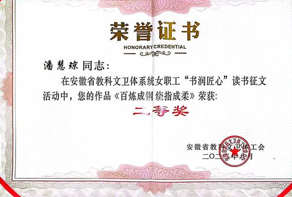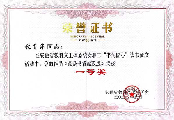 近日,安徽省教科文卫体工会对安徽省教科文卫体系统女职工“书润匠心”读书征文活动获奖情况进行了通报。我院张香萍老师和潘慧琼老师的作品在210篇征文作品中脱颖而出,分别荣获一等奖和二等奖。