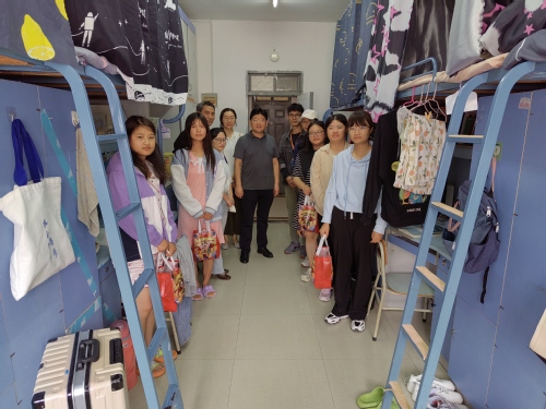 在中秋节和国庆节到来之际,为了解学生情况和思想动态,为学生营造一个安全、健康和舒适的学习生活环境,9月29日上午,学院党委书记王龙建、全体新生辅导员一行深入学生宿舍,看望慰问国庆留校2023级新生,为同学们发放了月饼、水果等慰问品,并为他们送上节日祝福。