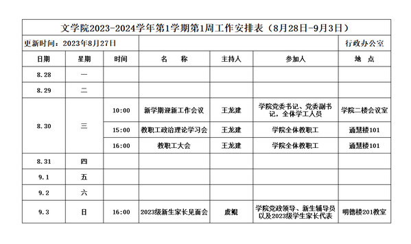 文学院2023-2024学年第1学期第1周工作安排表(8月28日-9月3日)