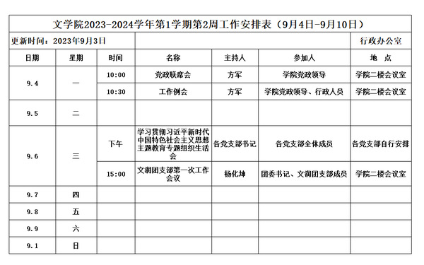 文学院2023-2024学年第1学期第2周工作安排表(9月4日-9月10日)