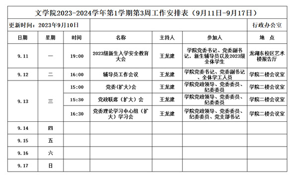 文学院2023-2024学年第1学期第3周工作安排表(9月11日-9月17日)