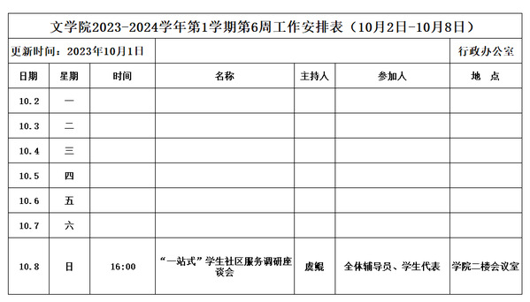 文学院2023-2024学年第1学期第6周工作安排表(10月2日-10月8日)