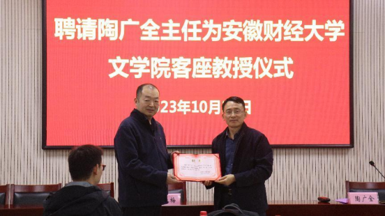 讲座开始前,方军为陶广全颁发文学院客座教授聘书和新闻与传播专业硕士校外实践导师聘书。