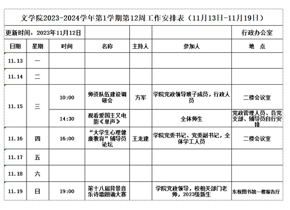 文学院2023-2024学年第1学期第12周工作安排表(11月13日-11月19日)