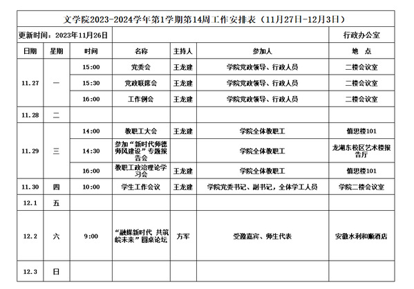 文学院2023-2024学年第1学期第14周工作安排表(11月27日-12月3日)