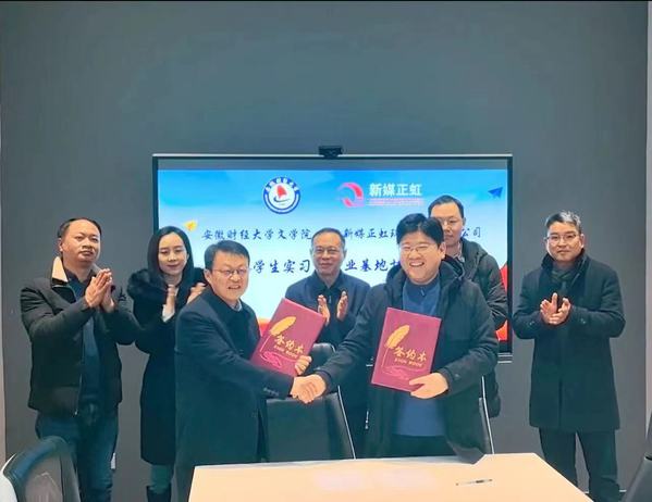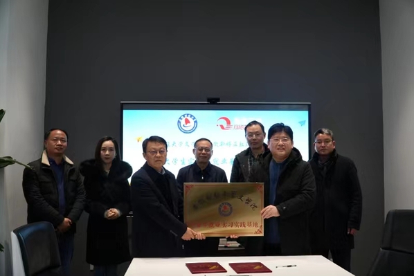 1月10日下午,文学院一行赴合肥与安徽新媒正虹环境科技有限公司举行了大学生就业实习实践基地授牌签约仪式。文学院党委书记王龙建、副院长杨化坤、新闻传播系教师李大元,安徽新媒体集团党委书记、董事长章理中,安徽新媒正虹环境科技有限公司党支部书记、董事长魏兴诗等人参加了此次活动。