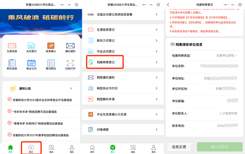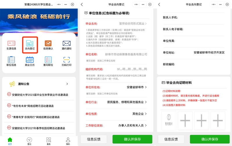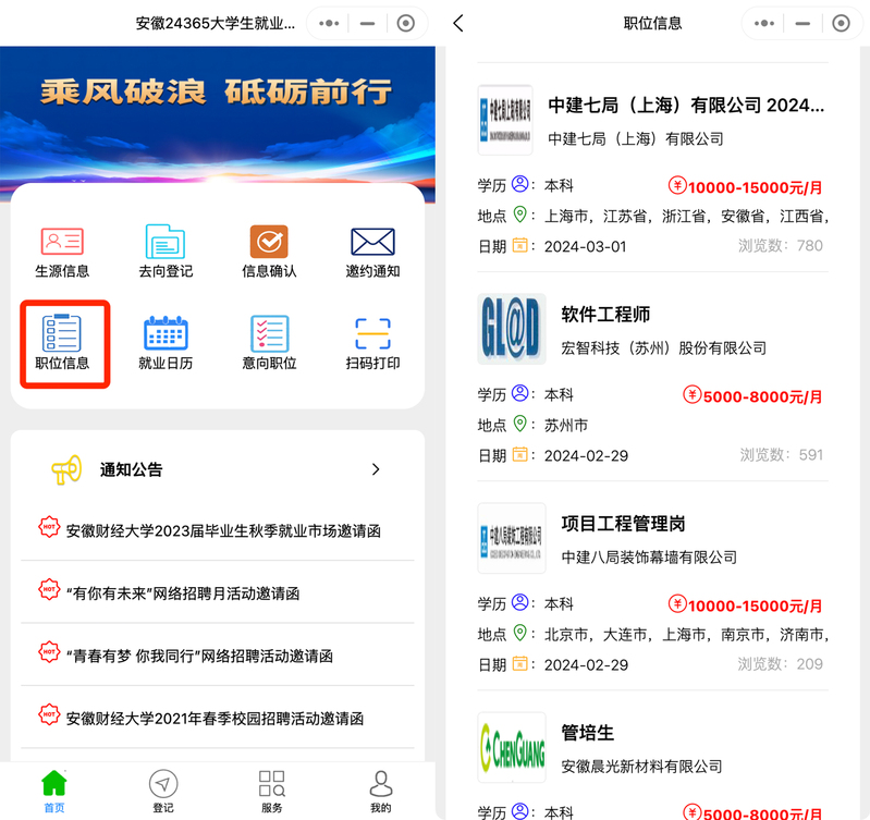 “安徽24365大学生就业服务平台”以信息化手段,提供从就业指导到职位申请等一系列服务,旨在为即将步入职场的毕业生搭建一个全面、便捷的就业信息桥梁。学生绑定微信小程序后即可查看生源信息、去向登记、职位信息、就业日历等,具体功能介绍如下: