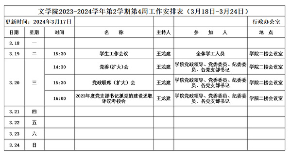 文学院2023-2024学年第2学期第4周工作安排表(3月18日-3月24日)