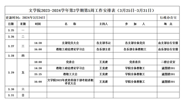 文学院2023-2024学年第2学期第5周工作安排表(3月25日-3月31日)