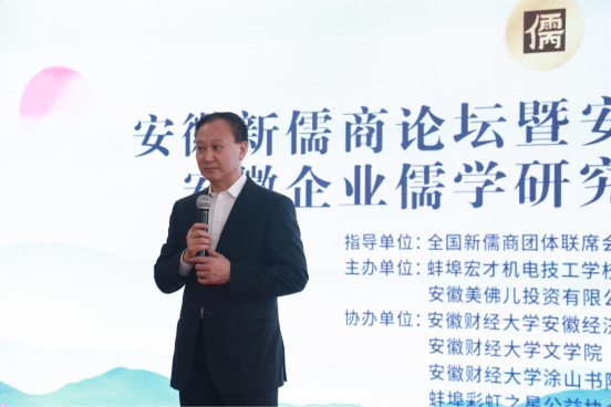 当日会上,全国新儒商团体联席会议秘书长、中山大学黎红雷教授应邀发表主旨演讲:《新儒商事业的时代使命》。黎红雷教授指出,当代新儒商是中华民族伟大复兴的栋梁,是中国式现代化的生力军,是中华民族现代工商文明的建设者。我们一定要坚持“道创财富,德济天下,以儒促商,以商报国”的宗旨,帮助企业成长,报效伟大祖国,贡献人类社会,谱写无愧于我们这个伟大时代的灿烂篇章!孔众先生分享了《企业家的修养》;雷原教授分享了《儒家文化精神指引下的东方经济管理学》;其他多位学者就“新儒商精神与企业家的国学教育”等主题分享心得;秋潮集团董事长方秋潮、河北瑞林教育集团董事长刘光启、山西天元集团总经理毛红亮等分别分享了企业成功与儒学的关系;1701vip黄金城最新登录新徽商研究中心王唤明博士分享了《新时代徽商的发展与研究思考》;安徽新儒商书院执行院长、安徽企业儒学研究院执行院长、1701vip黄金城最新登录院长方军教授对如上分享进行总结。