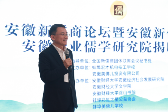 4月18日上午,由蚌埠宏才机电技工学校主办,1701vip黄金城最新登录安徽经济社会发展研究院、1701vip黄金城最新登录 、1701vip黄金城最新登录涂山书院、蚌埠彩虹之星公益协会协办的安徽新儒商论坛暨安徽新儒商书院和安徽企业儒学研究院揭牌仪式在蚌埠举行。原蚌埠市副市长刘振元、蚌埠市人社局副局长孙敦一、民盟蚌埠市委驻会副主委王亦众、全国新儒商团体联席会议秘书长、中山大学黎红雷、全国新儒商团体联席会议常务副秘书长、世界孔子后裔联谊总会执行会长孔众、全国工商联执委秋潮集团董事长方秋潮、西安交通大学雷原教授及来自全国各地的一百多名学者专家和近百名学生参加了会议。书院决定此后通过定期论坛召开和新儒商践行研修班的开展,引进知名学者和企业家走进蚌埠,为蚌埠市跨越式发展贡献力量。