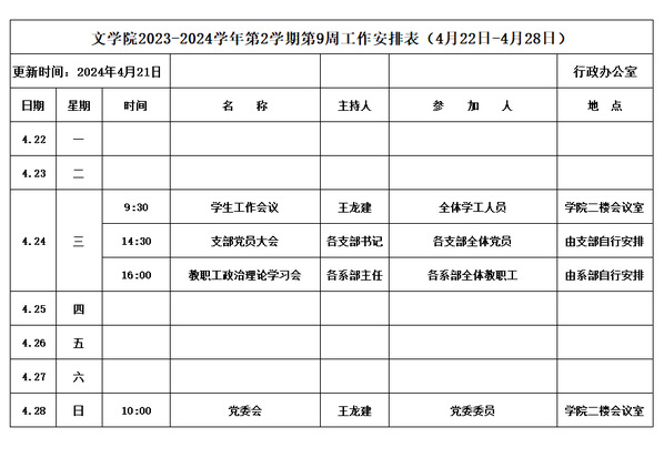 文学院2023-2024学年第2学期第9周工作安排表(4月22日-4月28日)