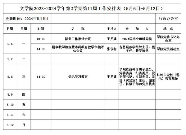 文学院2023-2024学年第2学期第11周工作安排表(5月6日-5月12日)