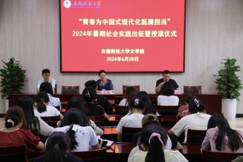 为深入学习贯彻习近平新时代中国特色社会主义思想和党的二十大精神,引导和帮助青年学生在社会课堂中受教育、长才干、作贡献,6月28日下午,文学院在西校区图书馆三楼报告厅举行2024年暑期社会实践出征暨授旗仪式。文学院党委副书记虞鲲,团委书记范璇,团委副书记李伟,社会实践团队指导老师和学生负责人参加了仪式。