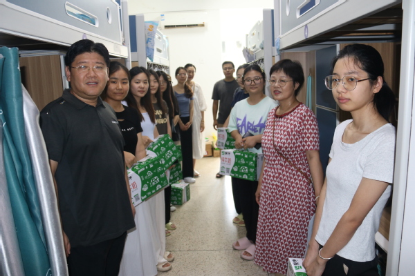走访过程中,王龙建与同学们沟通交流,深入细致地了解了同学们暑期的学习、住宿、饮食等情况,仔细询问了同学们的学习规划、考研过程中择校择专业的困惑以及对学校管理服务的意见或建议,积极回应学生的合理诉求与关切,叮嘱他们在安排好学习的同时也要注意人身财产安全。他对暑期留校备考的学生给予鼓励与肯定,希望同学们进行合理规划,充分利用暑期的宝贵时光,做到劳逸结合,在学习、实践过程中不断攻坚克难、勇攀高峰,为今后的发展打下坚实基础。慰问过程中,学院领导还为同学们发放了牛奶等慰问品,送上诚挚的暖心祝福,用实际行动传递学院的关爱与期望。