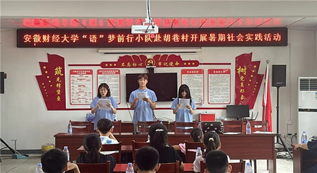 历经两个小时的路程,团队于上午9点抵达怀远县胡巷村,一下车就见到村头田间阳光下晶莹剔透的绿提与鲜嫩水灵的各类蔬植一派生机勃勃。魏庄镇组织委员谢晓东、胡巷村胡克文书记向实践团队介绍了胡巷村方言发展历史沿革、当前的发展状况、新时代发展面临的主要挑战等等。座谈过程中,大家了解到,胡巷村共有7个自然庄、676户、总人口3300人,村民间彼此主要使用方言进行交流,初中及以上学历的村民能够用普通话进行基本交流,而学龄前儿童和老年人几乎完全不懂普通话。语言是人际交流的重要载体,在经济发展和社会生活中扮演着重要角色,在市场经济高度发达的今天,生涩难懂的方言限制了农村地区的发展,往往因语言不通而影响工作以及经济发展。由此可见,熟练掌握普通话是推动乡村振兴的一个关键。通过对当地情况的了解,团队成员也感受到此次普通话推广工作的重要性,同时更坚定了做好此次推广活动的信心,同时也提出了如举办丰富多彩的文体活动、讲授普通话普及课程等建议,用以丰富村民的精神文化生活,让文明普通话在胡巷村蔚然成风。