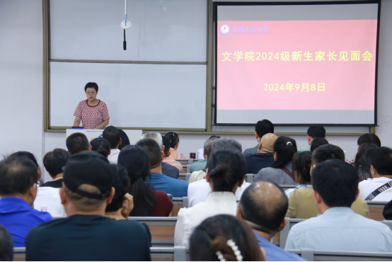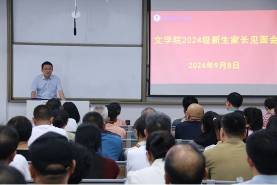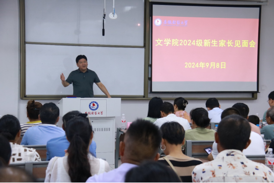 为有效促进家校沟通联动,更好助力学生成长成才,9月8日下午,文学院在龙湖西校区图书馆101教室召开2024级新生家长见面会。学院党委书记王龙建,院长方军,党委副书记虞鲲,副院长张俊梅、杨化坤、常春梅,新生专职辅导员、朋辈辅导员以及新生家长代表参加会议。虞鲲主持会议。