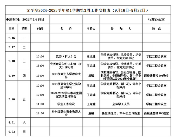 文学院2024-2025学年第1学期第3周工作安排表(9月16日-9月22日)
