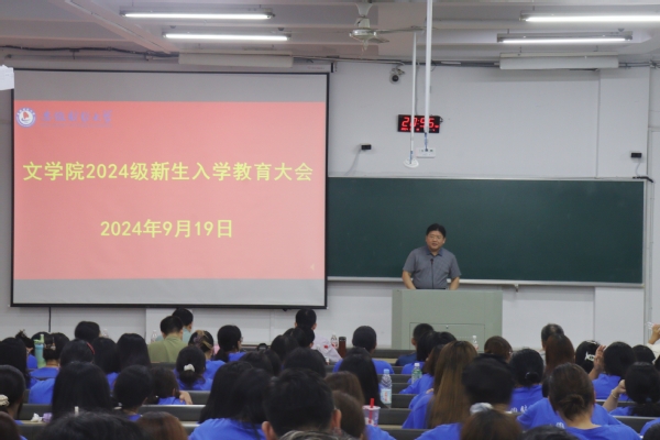 为扎实做好新生入学教育工作,帮助新生更快、更好地适应校园生活,9月19日晚,文学院举办2024级新生入学教育大会。学院党委书记王龙建,院长方军,党委副书记虞鲲、副院长杨化坤出席会议。各系部主任、院长助理,新生学业辅导员、专职辅导员以及2024级全体新生参加会议。会议由虞鲲主持。