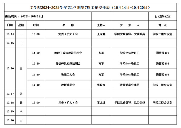 文学院2024-2025学年第1学期第7周工作安排表(10月14日-10月20日)