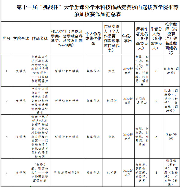 文学院关于第十一届“挑战杯”大学生课外学术科技作品竞赛校内选拔赛院内初赛优秀作品的公示