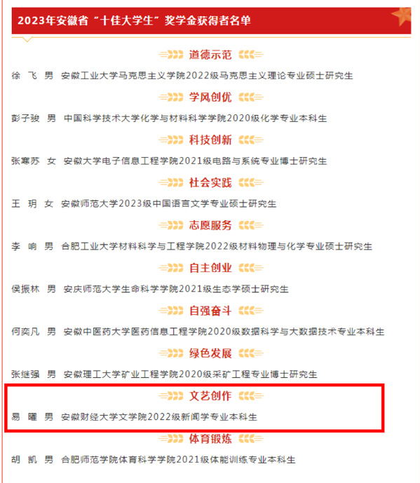 据悉,2023年安徽省“‘十佳’‘百优’大学生”选树评选工作按照道德示范、学风创优、科技创新、社会实践、志愿服务、自主创业、自强奋斗、生态保护、文艺创作和体育锻炼10个类别进行,经高校推选、专家评审团评审、网络风采展示、特邀评审团评审等环节,评选出安徽省“十佳大学生”10名和“百优大学生”100名。易曜同学在文艺创作方面成绩突出,经过层层筛选和选拔,最终荣获文艺创作类安徽省“十佳”大学生奖学金。
