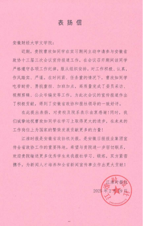 实习期间,同学们立足岗位工作,认真履职负责,在专业老师的指导下,积极参与到新闻传播工作的实践中去,展现出了卓越的综合素养。在蚌埠日报社,同学们虚心学习,勤于钻研,向实践导师努力学习和运用新媒体技术,将传统新闻报道与短视频、直播等形式相结合,为提升自身的专业实践能力打下了基础。在江淮时报,2023级新闻学2班曹欣如同学主动申请参与安徽省政协十三届三次会议的宣传报道工作,在会议期间严格遵守各项工作纪律,服从组织安排,对工作积极认真,作风踏实严谨,高质量完成了委员采访、视频剪辑以及公众号编发等工作,为此次会议的宣传报道作出了积极贡献,得到了安徽省政协和报社领导的一致好评。
